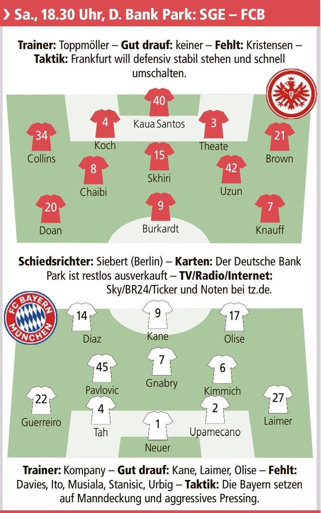 雷速体育10月4日讯 北京时间10月5日00:30,德甲第6轮,法兰克福坐镇主场迎战德甲领头羊拜仁慕尼黑,本场比赛开始之前,德国媒体《慕尼黑日报》预测了双方的首发阵容,拜仁慕尼黑由目前脚感火热的凯恩领衔,法兰克福方面会继续首发连场进球的土耳其小将詹·乌尊。 拜仁慕尼黑方面首发 守门员:1-诺伊尔 后防线:27-莱默尔、2-于帕梅卡诺、4-若纳唐·塔、22-格雷罗 中场:6-基米希、7-格纳布里、45-帕夫洛维奇 攻击线:17-奥利塞、9-凯恩、14-路易斯·迪亚斯 法兰克福方面首发 守门员:40-考阿·桑托斯 后防线:34-科林斯、4-科赫、3-泰特、21-纳撒尼尔·布朗 中场:8-查比、15-斯希里 攻击线:20-堂安律、9-伯克特、42-詹·乌尊、7-克瑙夫 |