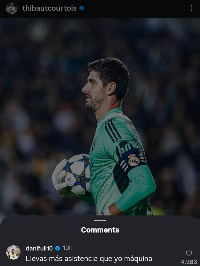 在皇马5-0客胜阿拉木图凯拉特的欧冠赛事中,门将库尔图瓦以一记精准后场长传助攻姆巴佩单刀破门,赛后他在社媒发布照片庆祝胜利,获得队友塞瓦略斯调侃:“你的助攻数已经超过我了。” 在欧冠小组赛皇马客场5-0战胜阿拉木图凯拉特的比赛中,门将库尔图瓦后场长传助攻姆巴佩完成破门。赛后库尔图瓦在社交媒体发布比赛照片庆祝本场胜利,队友塞瓦略斯调侃称:“你的助攻数已经超过我了。” 本赛季塞瓦略斯共为皇马出场6次,其中3次首发,暂无进球以及助攻;库尔图瓦出场9次全部首发,已有一次助攻。