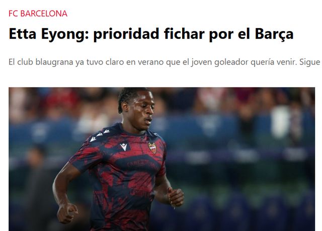 2025-26赛季西甲,效力于莱万特的21岁中锋埃塔-埃永大放异彩,8次出场,贡献5球3助,射手榜上排名第5,只落后姆巴佩(9球)、阿尔瓦雷斯(6球)。10月5日的《每日体育报》透露,巴萨盯上埃永,并将他视为优先引援目标。埃永的违约金为3000万欧元,切尔西、曼联也对他有意。 埃塔-埃永来自喀麦隆,身高1米81,速度快、爆发力强,门前嗅觉灵敏,风格很容易让人想起“猎豹”埃托奥。今年夏窗最后时刻,埃永从比利亚雷亚尔加盟莱万特,转会费仅300万欧元,签约4年。 来到莱万特之后,埃塔-埃永交出炸裂表现:8场西甲,埃永有5场进球,3场送助攻,仅有1场比赛没有进球或助攻(莱万特1-1赫塔菲)。埃永的身价爆发式增长,根据德转网站的估值,喀麦隆小将的身价从500万欧元涨到2000万,翻了3倍! 《每日体育报》透露,今年夏窗最后阶段,巴萨就想引进埃永,喀麦隆小将也一直在等待巴萨,但未能等到巴萨的报价。埃永加盟莱万特,比利亚雷亚尔设定回购条款,埃永的违约金,从黄潜时代的1000万欧元,涨到如今的3000万欧元。 埃永选择莱万特,是因为莱万特承诺首发地位。仅仅1个月之后,埃永就在西甲绽放光芒,诸多欧洲豪门都盯上喀麦隆中锋,英超的切尔西、曼联,也都派球探现场考察埃永。巴萨还想引进埃永,球员也向往更好的平台。 《每日体育报》指出,巴萨依旧关注着埃永,莱万已是37岁老将,球队需要寻找9号接班人。不过,明年夏天想引进埃永的话,一口价3000万欧元(违约金),没有任何商量的余地。无论莱万是走是留,巴萨明年一定要签9号中锋,马竞的“小蜘蛛”阿尔瓦雷斯是巴萨梦寐以求的目标,但转会费是天价;埃永则是一次赌博,3000万欧元不便宜,但未来可能会更高…… |