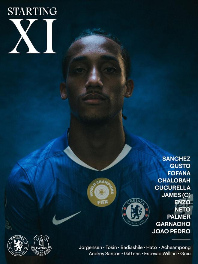 切尔西首发:1-桑切斯、27-古斯托、29-福法纳、23-查洛巴、3-库库雷利亚、24-里斯-詹姆斯、8-恩佐-费尔南德斯、7-内托、10-帕尔默、49-加纳乔、20-若昂-佩德罗 埃弗顿首发:1-皮克福德、15-奥布赖恩、6-塔尔科夫斯基、5-迈克尔-基恩、16-米科连科、27-格耶、37-詹姆斯-加纳、10-恩迪亚耶、22-迪尤斯伯里-霍尔、18-格拉利什、11-巴里