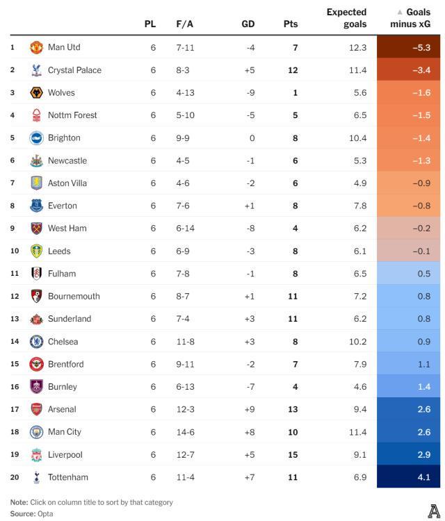 英超开季6轮,曼联又来到了和上赛季相似的积分榜倒数位置,阿莫林下课声此起彼伏。不过,日前竞技网的一番数据分析显示,曼联可能并没有积分显示得那么糟糕,阿莫林所说的“比赛结果没有反映出球队表现”也许不是完全没有道理。至少,在“预期进球”(xG)这项数据上,曼联其实是英超第一!