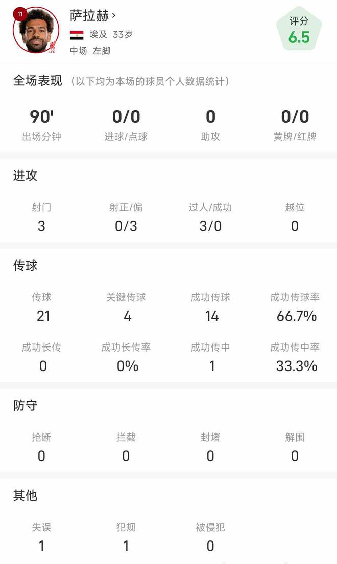 萨拉赫数据:3次射门未能取得进球,有4次关键传球但无助攻