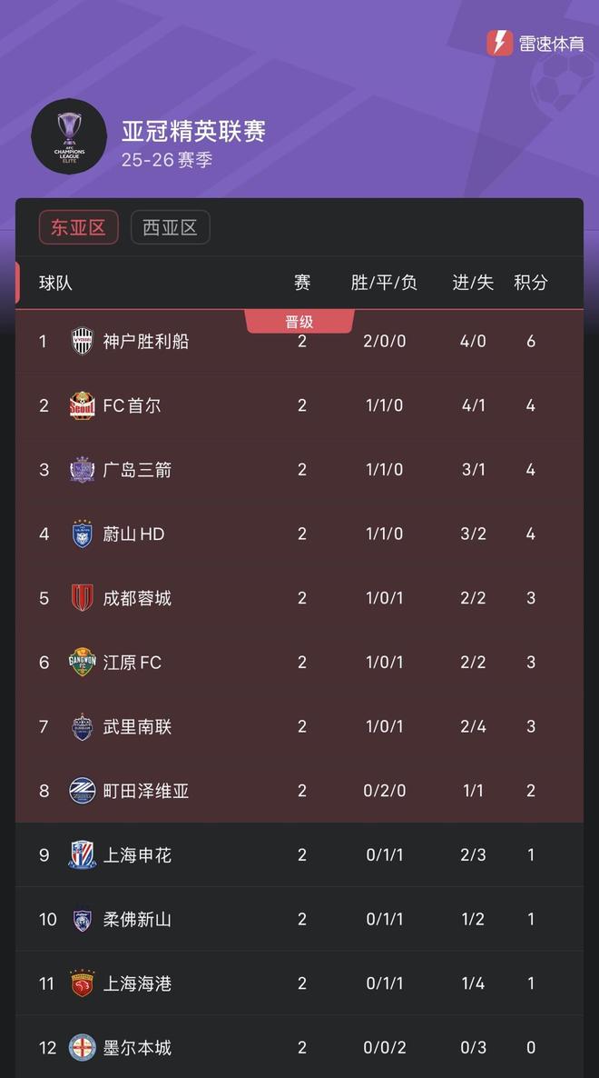 亚精英赛积分榜:成都蓉城3分暂列第5,申花第9,海港第11