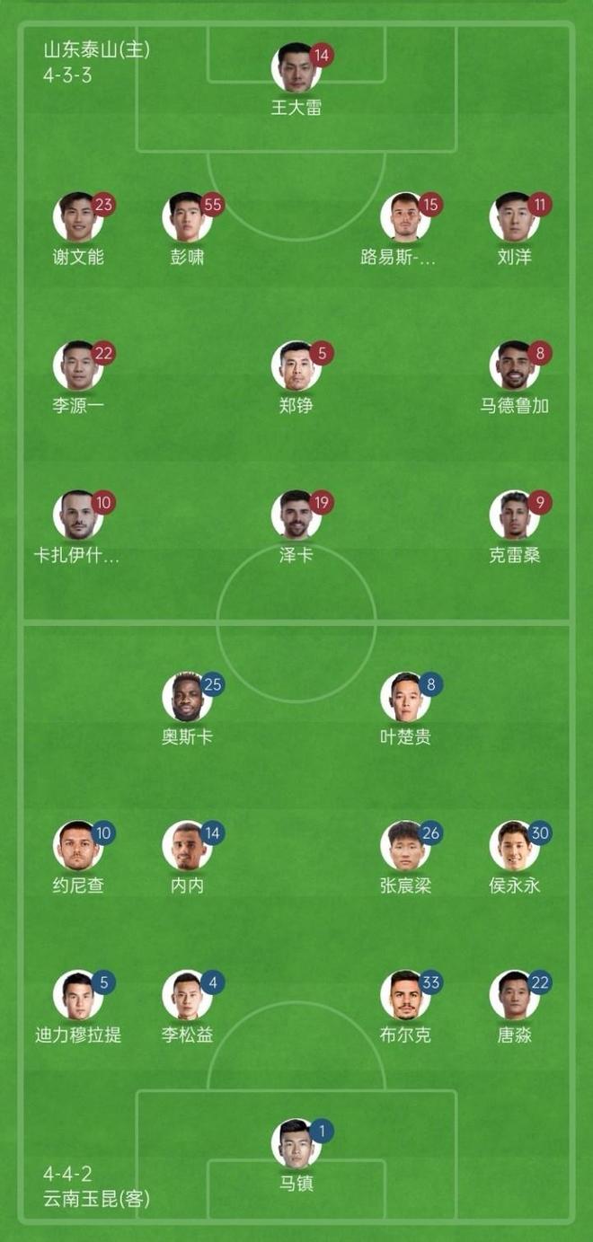 中超泰山VS云南首发阵容出炉:泽卡复出,“三叉戟”重装上阵
